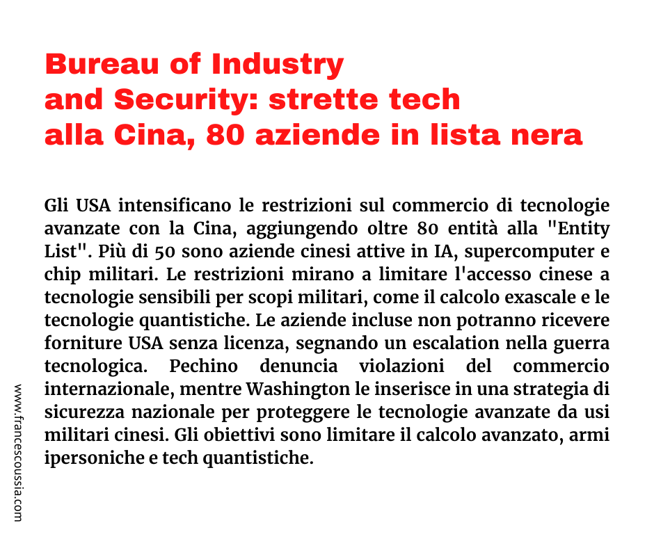 Bureau of Industry and Security: strette tech alla Cina, 80 aziende in lista nera