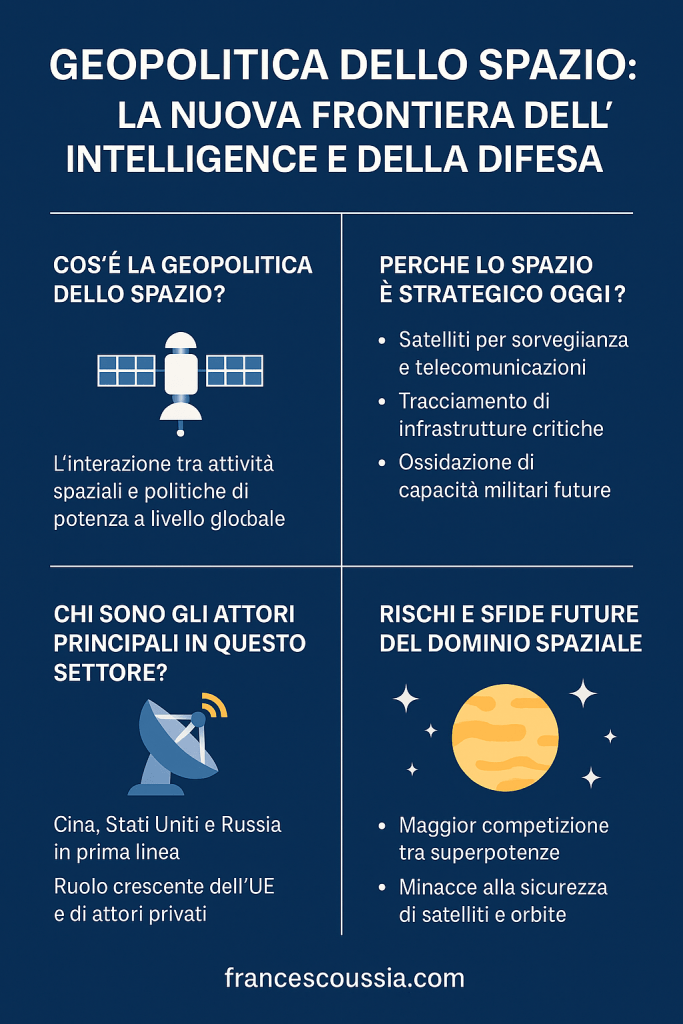 Lo spazio non è più solo teatro di esplorazione scientifica: è oggi un dominio strategico per la sicurezza globale. Tra satelliti, sorveglianza e tecnologie militari, la corsa allo spazio ridisegna equilibri geopolitici e capacità di intelligence. Ascolta l’audio che segue, per l’approfondimento.