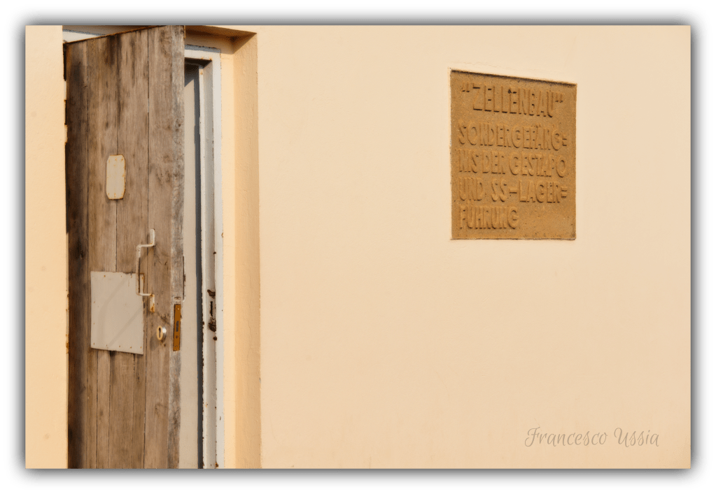 Una porta semi-aperta e una targhetta in pietra con la scritta ‘Zellenbau’ (Edificio delle Celle), l’area delle prigioni interne e delle esecuzioni.