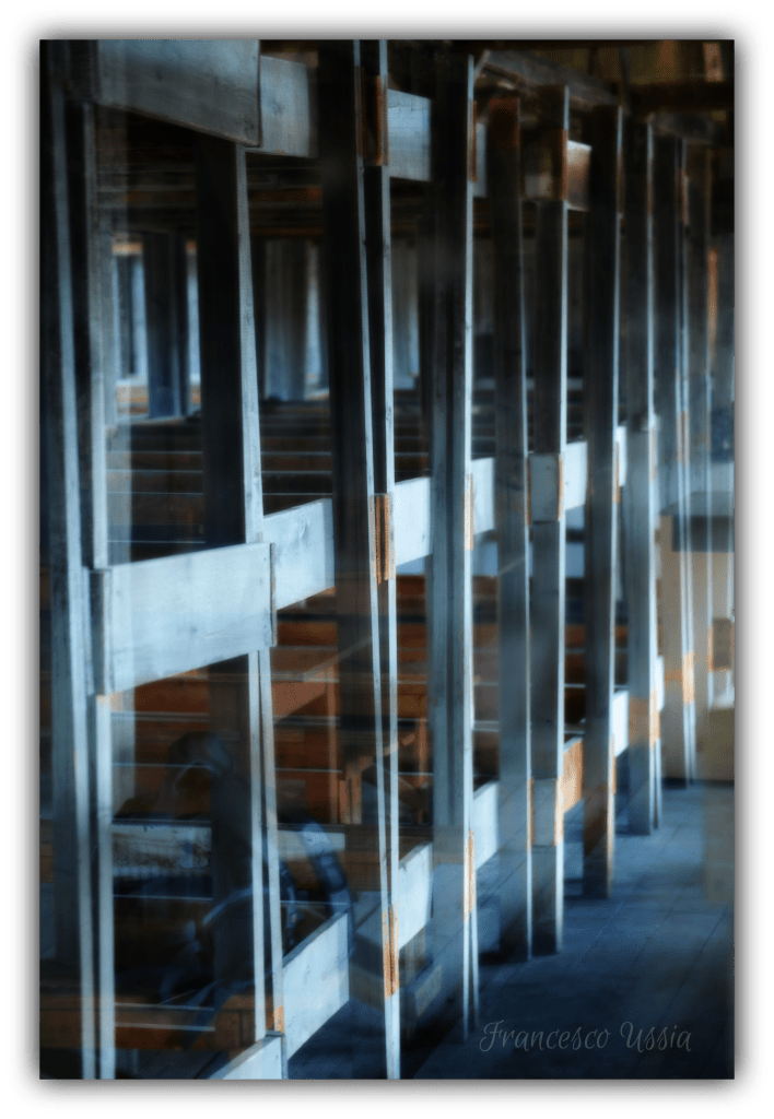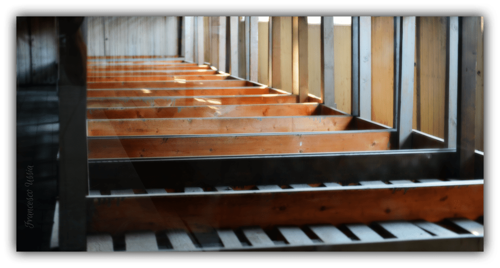 Le impalcature di legno, dove gli internati erano stipati in condizioni disumane. Queste strutture a più livelli, fredde e dure, rappresentano la cruda realtà della sovrappopolazione nelle baracche. Ogni gradino che sale o scende evoca il peso dei corpi esausti, le malattie che si diffondevano rapidamente e la costante mancanza di spazio personale. Era qui che migliaia di prigionieri trovavano un riposo effimero, un giaciglio condiviso con l’incubo di un’esistenza priva di ogni dignità e speranza.