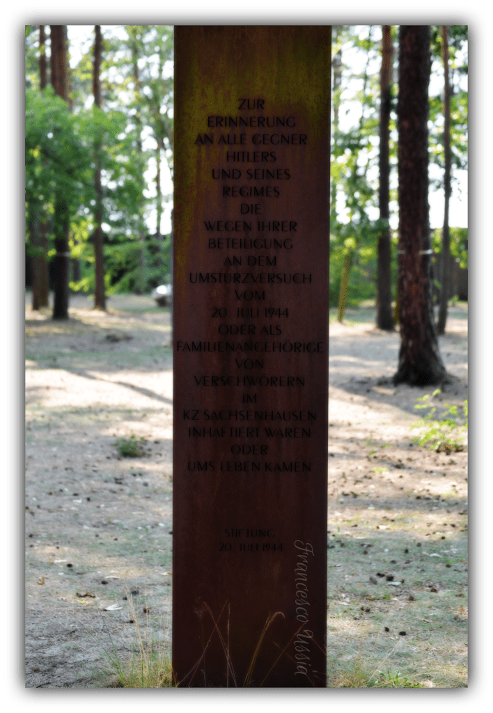 Anche in un luogo di tale orrore, emerge la luce della resistenza e del ricordo. Questa stele, immersa nel silenzio del bosco che circonda il campo, è dedicata a coloro che si opposero al regime di Hitler, inclusi i partecipanti al tentato colpo di stato del 20 luglio 1944 e le loro famiglie, molti dei quali trovarono la prigionia o la morte proprio qui. È un toccante tributo al coraggio e alla memoria di chi ha combattuto per la libertà, un’affermazione che anche nelle tenebre più profonde, la dignità e la lotta per i valori umani non si spengono mai del tutto.
